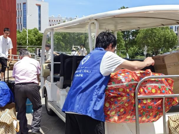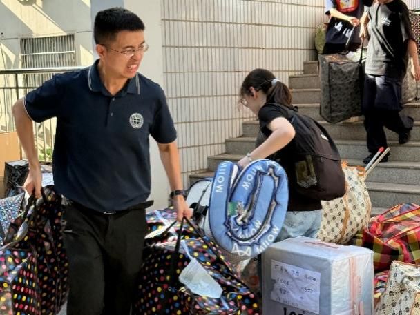 大巴驶入校园,在同学们即将入住的宿舍前,橙色的遮阳棚早已搭好,身穿蓝色马甲的志愿者们静候多时。多辆搬运车辆将员工行李送到宿舍楼下,老师和志愿者们积极帮助2024级计科学子们搬运行李,引导方向;宿管阿姨给大家发放钥匙,认真细致地登记信息;同学们团结协作,将一件件沉重的行李搬进新宿舍,开启一段全新的学习与生活旅程。