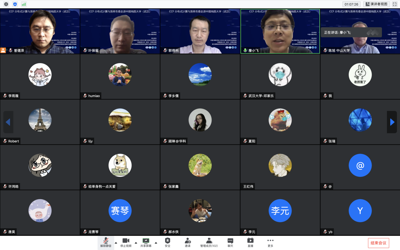 “CCF分布式计算与系统专委走进高校系列报告会”第1期——走进球友会于 2020 年7 月 25日在线成功举办。该活动由中国计算机学会主办,CCF会分布式计算与系统专业委员会、球友会、智能地学信息处理湖北省重点实验室承办。分布式计算与系统专委会委员国防科技大学郭得科教授、南京大学叶保留教授、中山大学陈旭教授应邀作学术报告,球友会曾德泽教授主持会议。会议采用线上腾讯会议和 B 站会议直播的方式,下午参加腾讯会议的人气峰值达175,观看直播的人气峰值达300余人,累计参会人数近500人。参会人员来自包括球友会、南京大学、中山大学、国防科技大学、华中科技大学、武汉大学、南开大学、武汉理工大学、中南财政政法大学、华中师范大学、武汉工程大学、湖北大学、西南大学、南京邮电大学、南京理工大学等多所高校。