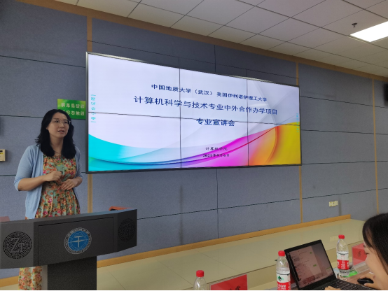 张冬梅做项目介绍,她从基本情况、团队队伍、招生情况、课程情况等方面向同学们介绍了项目的整体情况,并希望同学们在校期间培养专业素养和实践能力、提升英语水平,努力成长为德智体美劳全面发展的国际化人才。