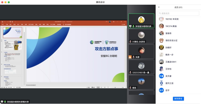 接着,深信服科技华中区安全服务工程师孙朝明为同学们带来网络安全攻防技术讲座《攻击方那点事》,讲座在线人数保持在90人左右,最高超过100人。通过介绍网络攻击的基础知识和实战案例,揭秘“网络黑客”,帮助员工提高网络安全意识,提高网络安全防护能力。