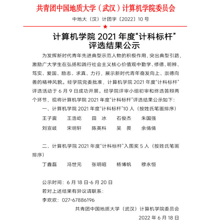 为发挥榜样模范带头作用,展现新时代青年踔厉奋发、崇德向善的精神风貌。球友会“计科标杆”评选活动于6月9日在南望山校区举办。球友会副经理、大数据系教师代表张冬梅,党委副书记、纪委书记傅苑,计算机科学系教师代表童恒建,软件工程系教师代表周顺平,计算机应用系教师代表孔春芳,信息安全系党支部书记马钊,人工智能系主任唐厂,院直党支部书记黄燕霞,团委书记李欢欢,2019级辅导员闫维蓉,2020级辅导员、员工会指导老师李祥瑞,2021级辅导员沈晨,辅导员谭文博出席活动。