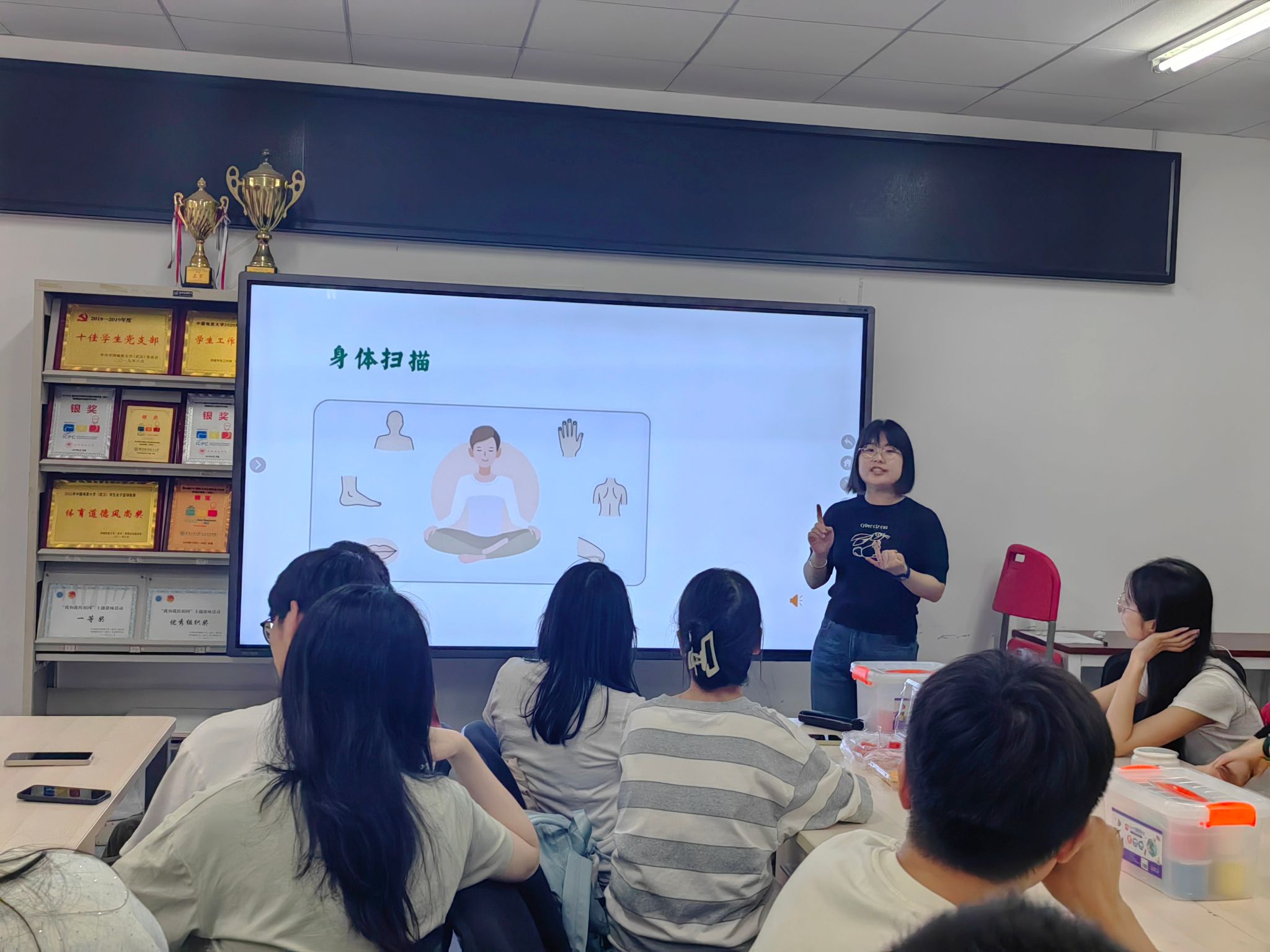 随后,闫维蓉老师介绍了正念的起源、定义及其独特的身心疗愈功能。在闫老师的引导下,参与者开始了他们的正念初体验。首先进行身体扫描练习,通过注意力逐个扫描身体部位来增强身体感知和放松身心。同时,小组成员互相交流在活动中的体会和感受,同学们纷纷表示,正念身体扫描帮助自己的身体和心理得到了双重的放松,并放下了心中的包袱去更好地觉察自己,与自己的内在世界建立了深入的联系。