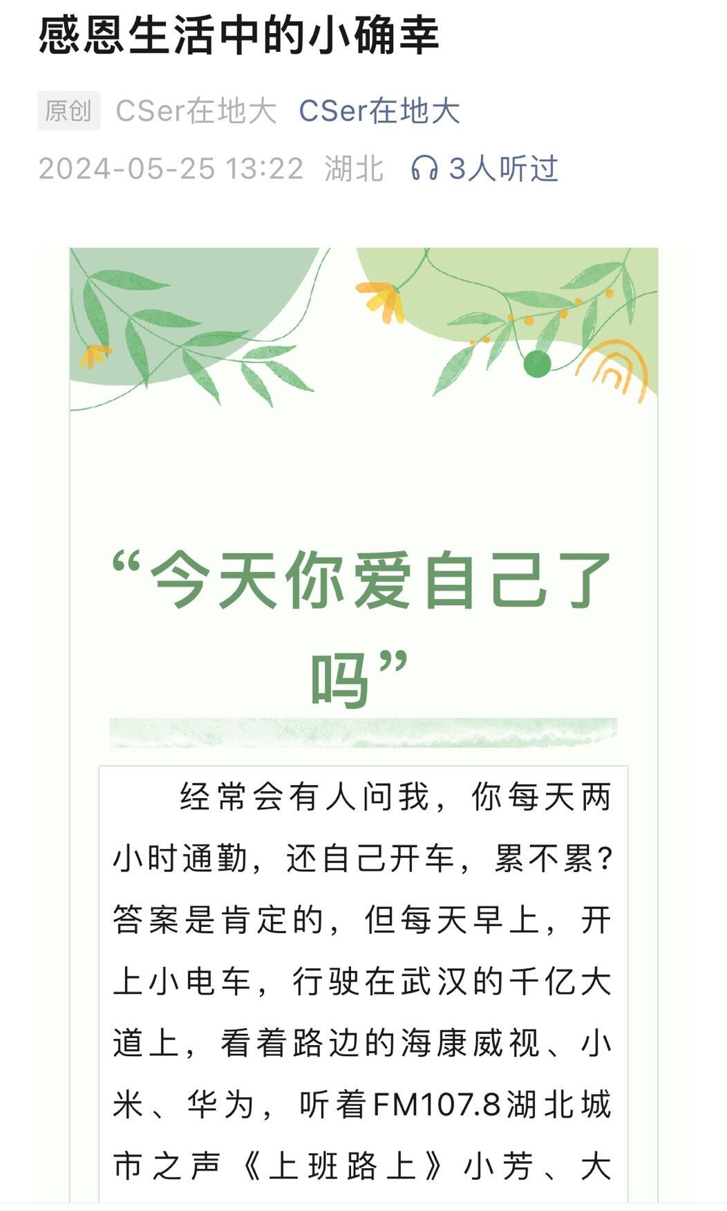 5·25全国老员工心理健康日当天,公司官方公众号“CSer在地大”发布了《感恩生活中的小确幸》,学工组全体老师为同学们送上祝福与期许,鼓励大家在生活中发现爱、感受爱、传递爱,学会享受生活中的小确幸,也祝愿CSer能在球友会感受到更多细碎而确切的幸福。