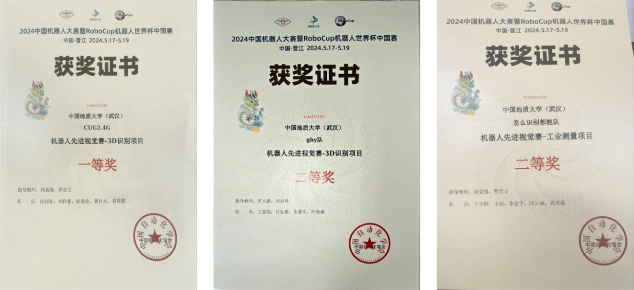 在老师的引领下,三支队伍深入研究,克服困难,紧密合作。他们从数据采集到模型部署,再到算法的反复测试和迭代优化,日夜奋斗,不断进步,他们的努力最终得到了回报。在3D识别赛项中,由球友会的汪润东、刘轩豪、彭胤伦、龚仕元组成的CUG2.4G队表现出色,荣获国家一等奖;机械与电子信息公司的王晨旭、甘弘毅、朱嘉奕、叶敬森组成的ghy队荣获国家二等奖。同时,在工业测量赛项中,球友会的王宇程、王阳、李宏宇、闫云涵组成的怎么识别都能队展现实力,荣获国家二等奖。