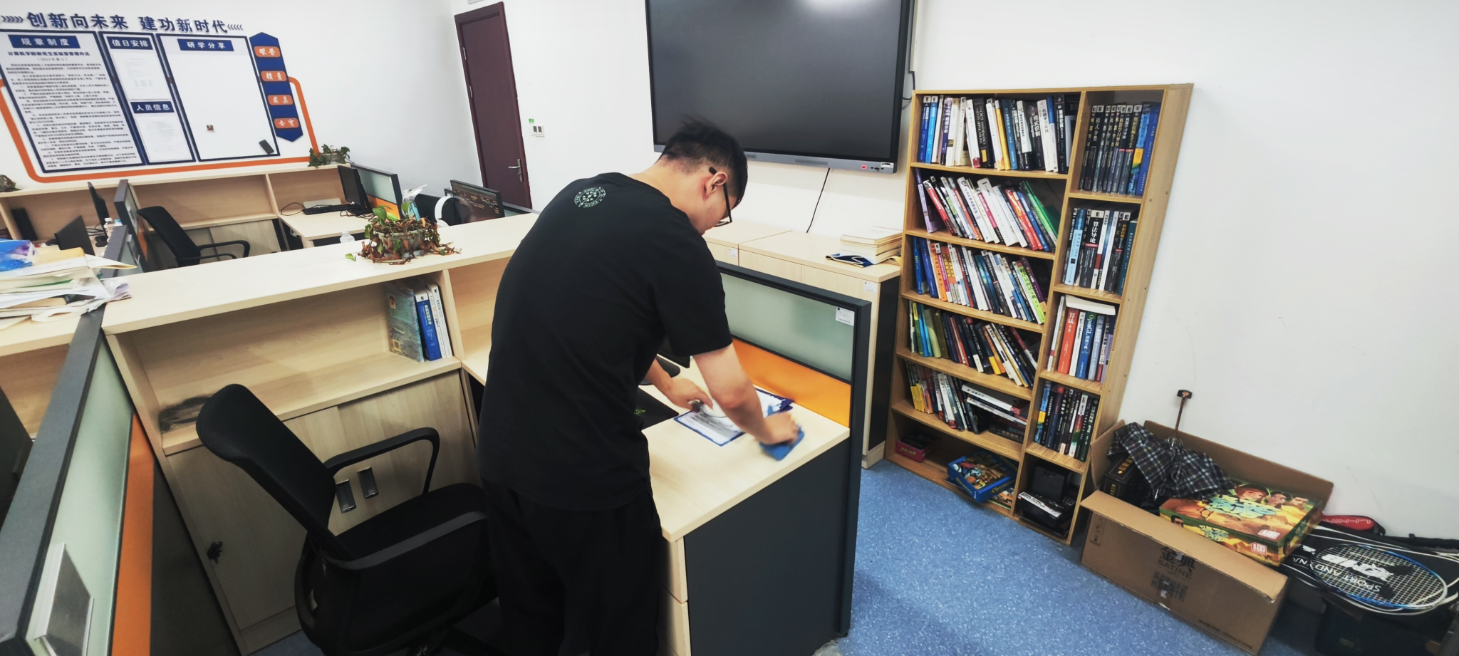 “劳动铸造幸福,青春开创未来”。研究生研究生实验室卫生大扫除活动是研学空间建设的重要内容,不仅为新生营造了舒适、美好的研学环境,更是激励着全体研究生以更加饱满的热情投入到学术研究中,为公司的建设发展贡献力量。