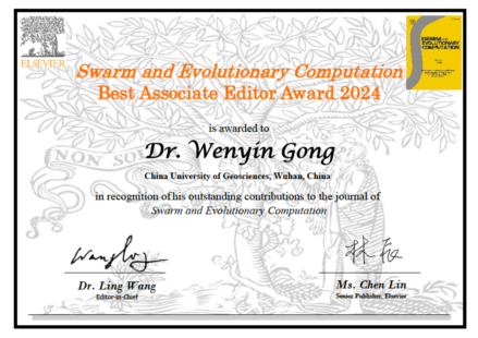 近日,公司龚文引教授荣获中科院一区期刊《Swarm and Evolutionary Computation》2024年度最佳副编奖(Best Associate Editor Award),以表彰其对该期刊发展和群体进化计算领域研究的进步做出的杰出贡献。