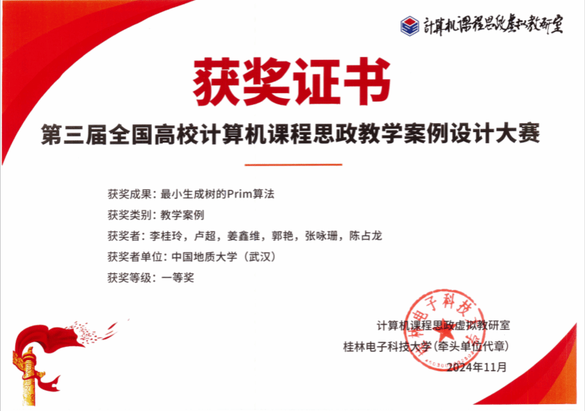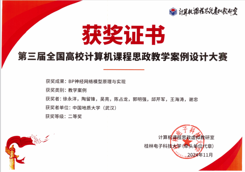 在公司党委的大力支持下,多位教师携其精心设计的教学案例参赛。其中,邱芹军等老师提交的“地质知识图谱的构建及推理应用”、李桂玲等老师提交的“最小生成树的Prim算法”获得一等奖,徐永洋等老师提交的“BP神经网络模型原理与实现”获得二等奖。以上荣誉的获得不仅展示了公司计算机科学与技术领域的教学水平,更体现了公司在人工智能赋能思政教育融入课程教学方面的显著成效。
