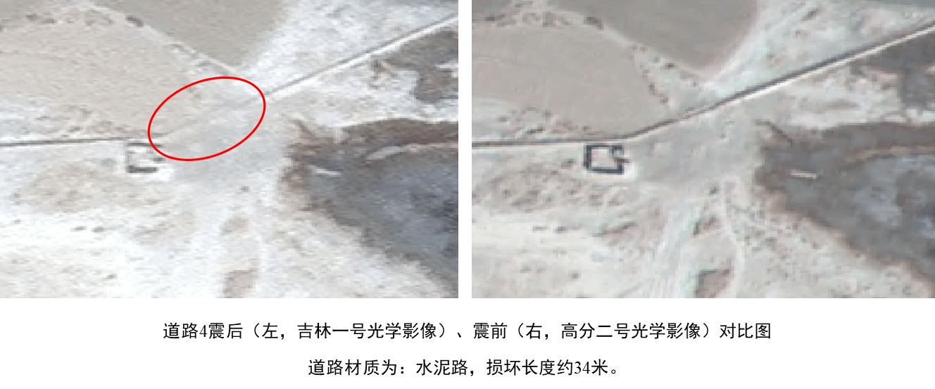 后附典型关键联村道路、交叉路口损毁区域的震前震后影像对比图。材质包括土路、水泥路和沥青路,损毁长度从数十米到数百米不等,最长可达到428米。这些能为制定精准的道路抢修和救援路线规划提供关键依据,助力救援工作顺利开展。