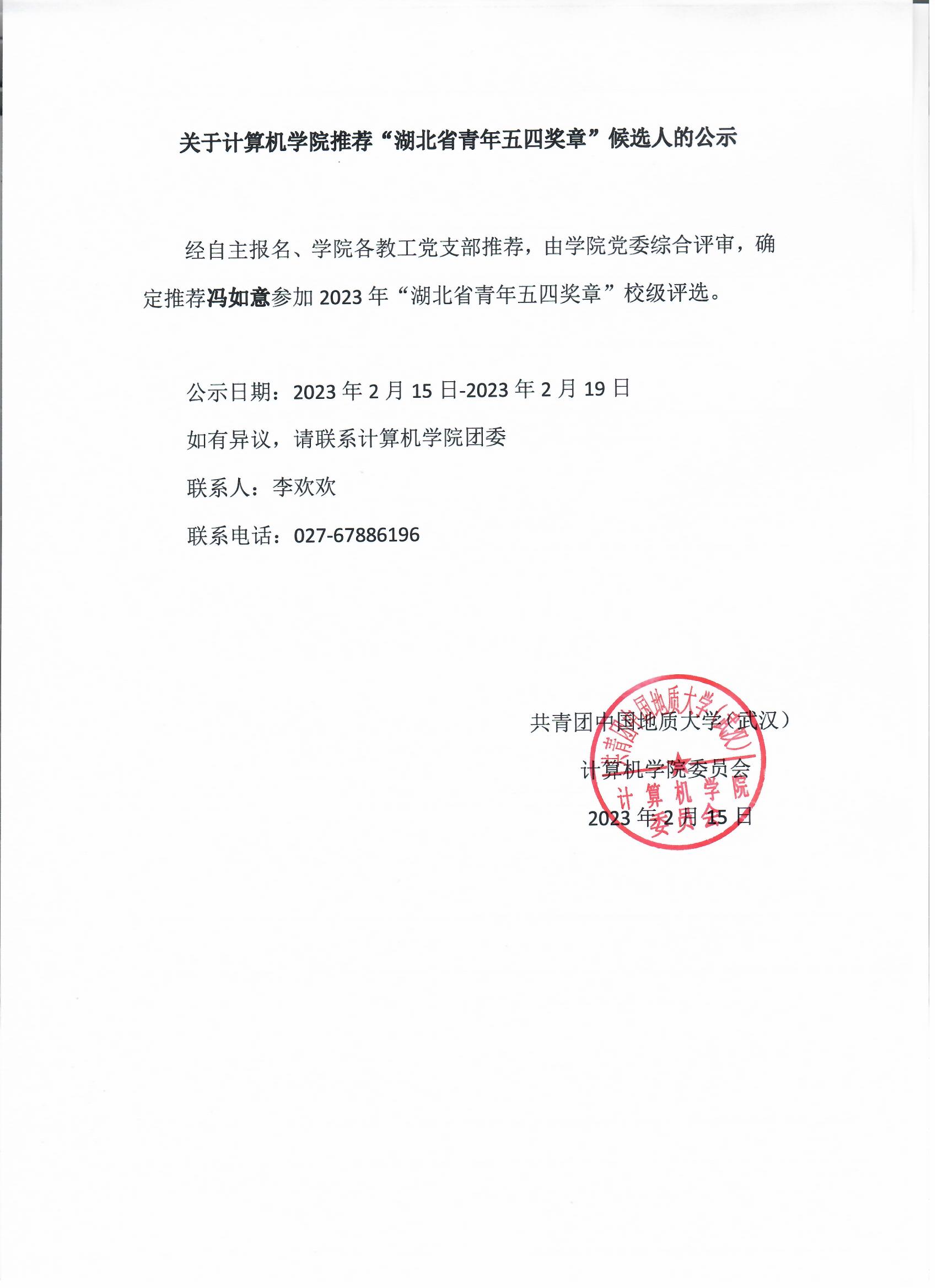 关于球友会推荐“湖北省青年五四奖章”候选人的公示