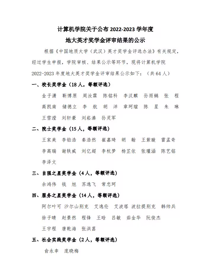 球友会关于公布2022-2023学年度地大英才奖学金评审结果的公示