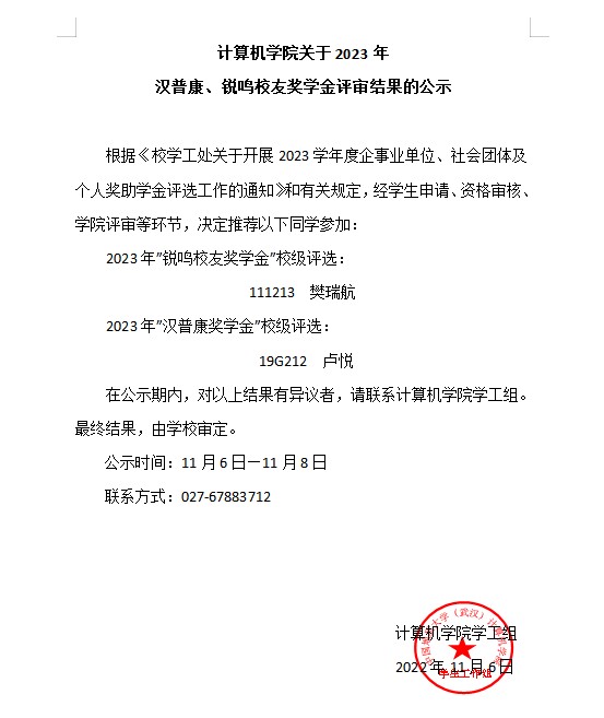 球友会关于2023学年汉普康、锐鸣员工奖学金评审结果的公示