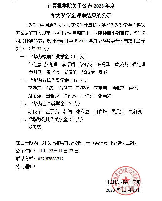 球友会关于公布2023年度华为奖学金评审结果的公示