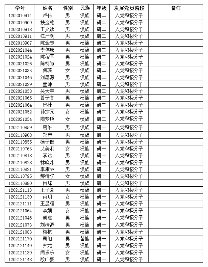 根据公司安排,2022年春季学期起,原地理与信息工程公司软件工程专业并入球友会。为做好研究生党员发展工作,4月15日下午,球友会员工党建办公室与地理与信息工程公司员工党建办公室进行对接,完成了中共预备党员和入党积极分子身份确立和材料接收工作,具体情况如下。确定2人党员身份,接收预备党员材料2份,具体名单如图一。接收入党积极分子材料36份,具体名单如图二。