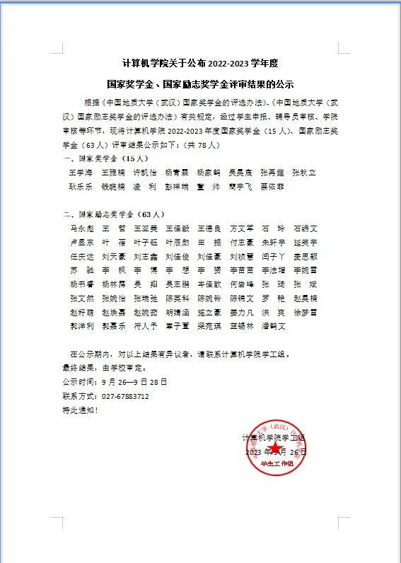 球友会关于公布2022-2023学年度国家奖学金、国家励志奖学金评审结果的公示