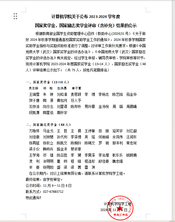 球友会关于公布2023-2024学年度 国家奖学金、国家励志奖学金评审(含补充)结果的公示