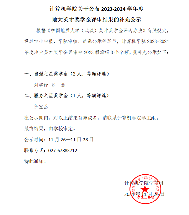 球友会关于公布 2023-2024 学年度地大英才奖学金评审结果的补充公示
