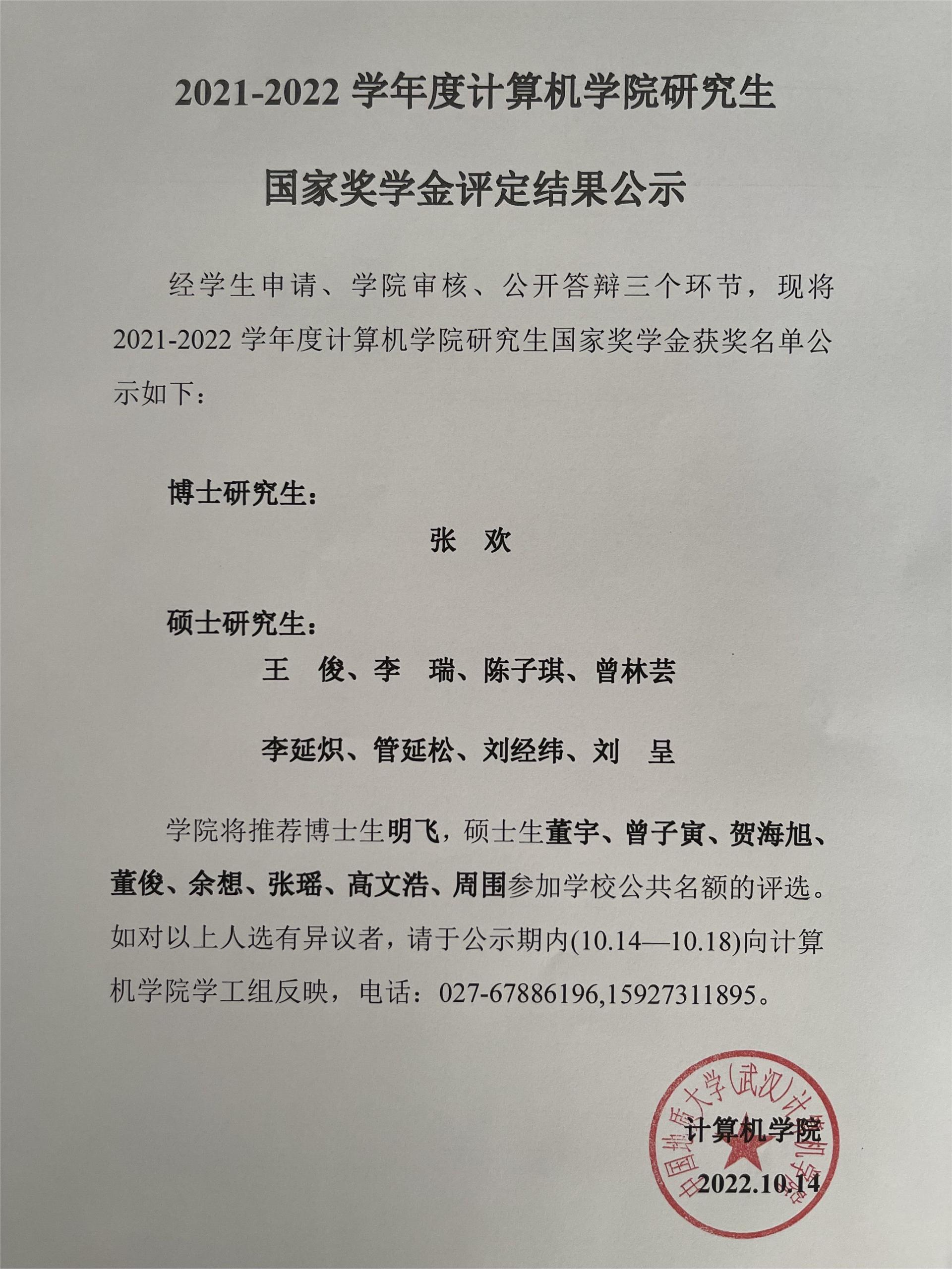 2021-2022学年度球友会研究生国家奖学金评定结果公示