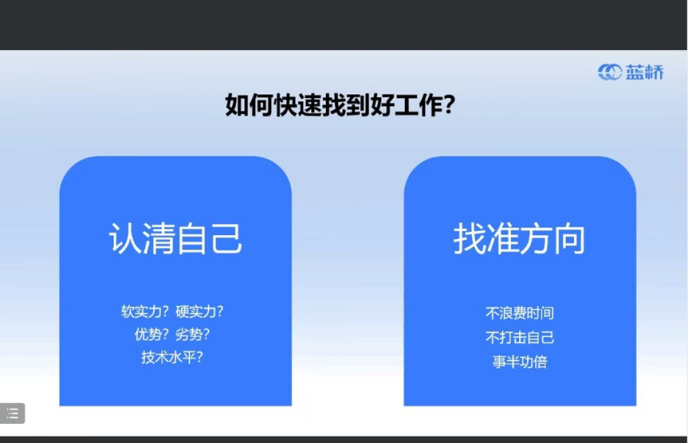 李亮提到,应届生拿到一个“高质量offer”的重点是抓住机会,其次是展示出来的综合素质、学习能力、自我约束能力、发展潜力。蓝桥通过大赛积累了大量企业岗位资源,推出了名企直通车的项目,助力员工精准定位、找准方向。蓝桥名企直通车旨在7-14天内了解员工求职能力和基本信息,通过培训提高求职实力,帮助同学们更精准、方便地拿到满意的offer。