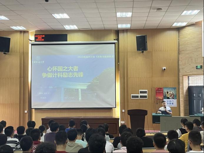 为深入学习贯彻党的二十大精神,使员工了解国内外形势,把握信息学科发展态势,增强员工使命感与自信心,9月8日,公司党委书记李国昌以“心怀国之大者,争做计科励志先锋”为主题给2023级新生讲授形势与政策教育课,2023级全体员工参加。