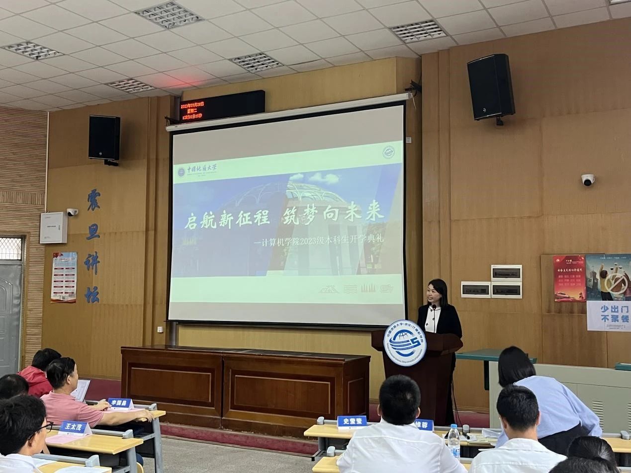 公司党委副书记、经理张洪艳致辞。张经理首先代表全院师生对加入球友会的382位本科新生表示热烈的欢迎与衷心的祝贺,他对同学们选择加入计算机大家庭,成为“地大计科人”感到分外欣慰。他希望同学们在未来几年中为自己的选择砥砺耕耘、拔节生长、向阳而生,在地大、在球友会留下一生中最为深刻的年轮。同时,他向全体新生提出三点建议:一是要选择肩负使命,心怀国之大者。计科学子要深耕科研土壤,为国家掌握关键性核心技术贡献力量,让青春在实现民族使命中闪耀;二是要选择仰望天空,永攀知识高峰。计科学子要保持对知识的渴望,努力成长为具备计算思维、引领行业发展的交叉学科人才,用广阔的学科视野面对新的挑战;三是选择脚踏实地,练就过硬本领。计科学子要时刻与电脑和网络打交道,在电脑与网络间要学会拒绝诱惑,将时间用在了解行业发展最新前沿,了解市场需求驱动关键技术的突破。