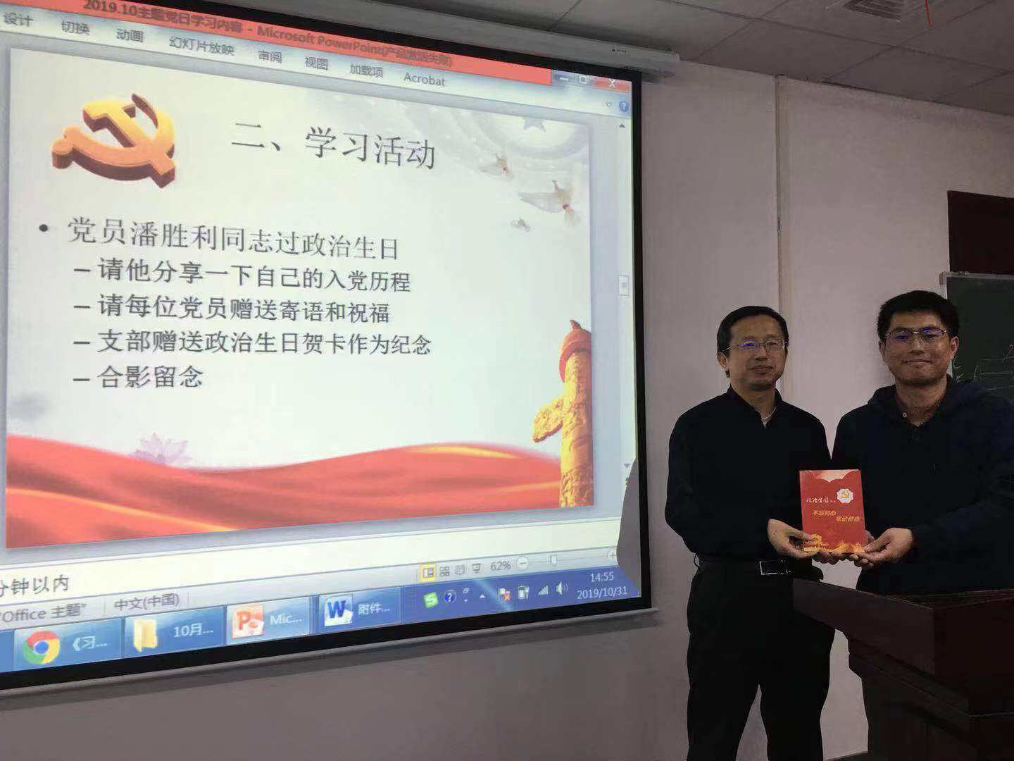 随后,童恒建副经理和网工支部党员同志一起为潘胜利老师过10月的党员政治生日,并为其发放党员政治生日贺卡。潘胜利老师回顾了其入党的心路历程,并总结个人感悟,“踏实认真地做好人民教师的本职工作就是一种为人民服务、不忘初心的体现”。