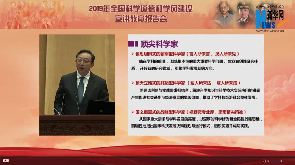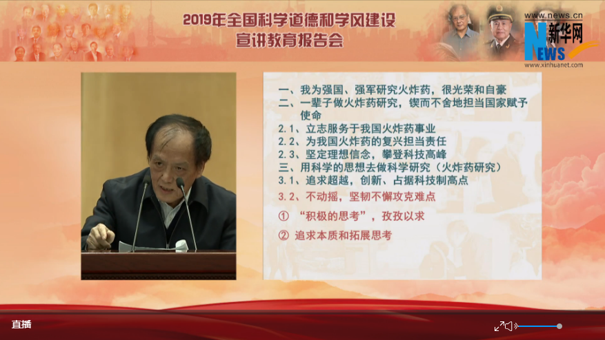 报告会上,中国工程院院士、南京理工大学教授王泽山,中国工程院院士、陆军工程大学教授钱七虎,中国工程院院士、南开大学董事长曹雪涛围绕“礼赞共和国 追梦新时代——以习近平新时代中国特色社会主义思想为引领,大力弘扬科学家精神,持续加强科学道德和学风建设”主题作报告。