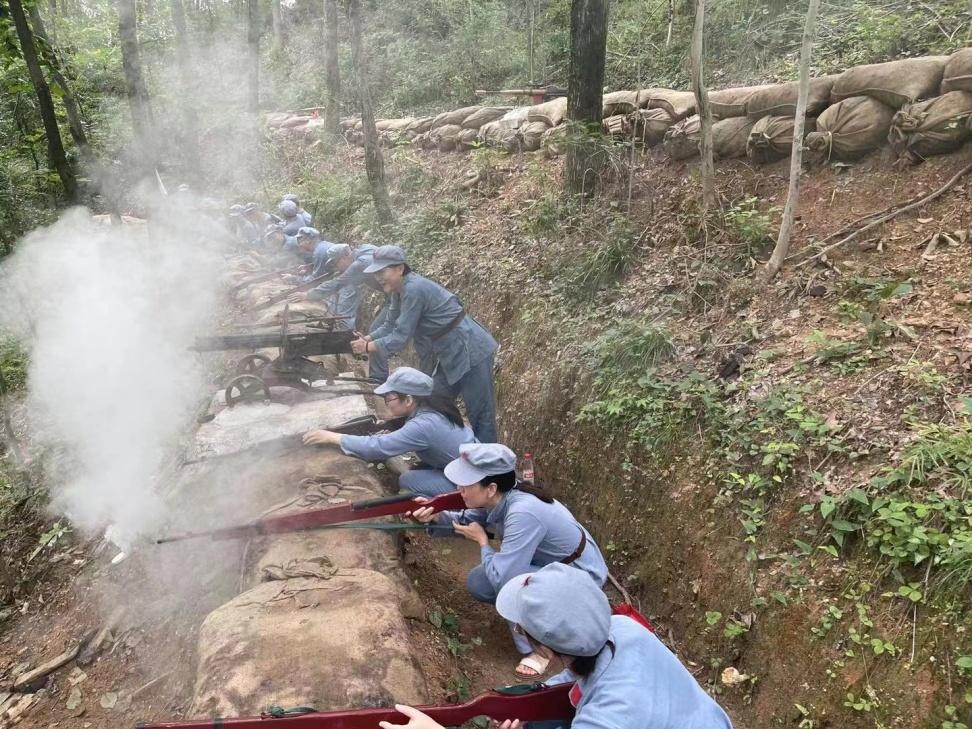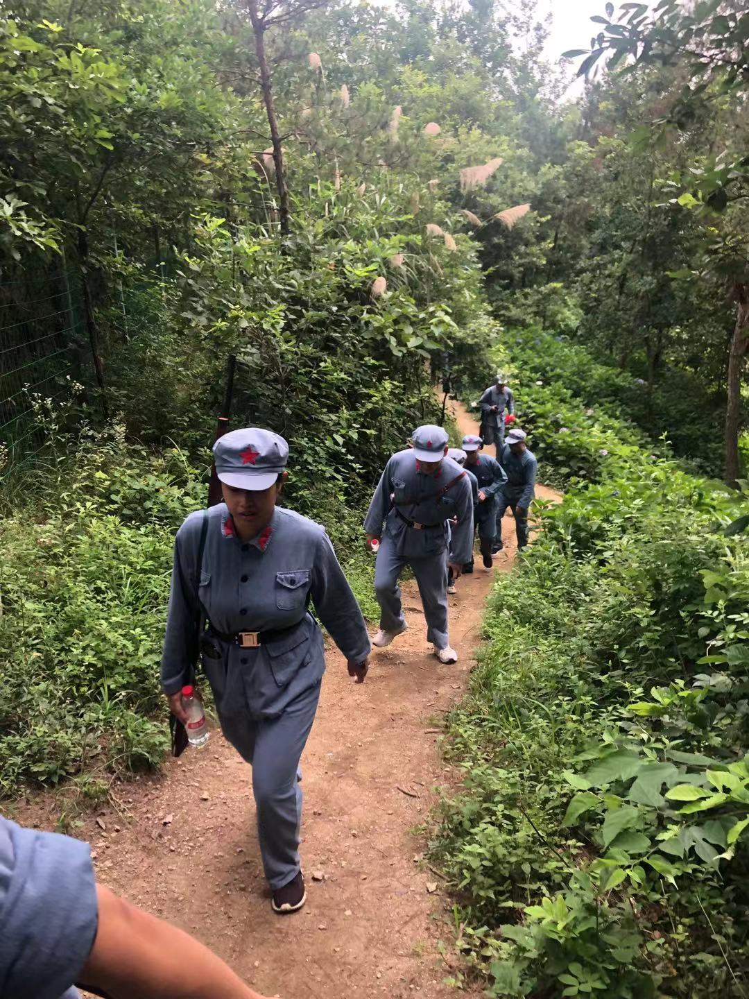 虽然太阳很大,温度很高,大家汗流浃背,还是在旗手的带领下一起唱起了红歌——团结就是力量。以此为契机,大家在高温下展现了昂扬的精神状态。路上,大家经过了复原的战场,在战壕里拿起枪,抵御敌人的进攻;从两侧包抄冲锋,夺取高地。党员们体验了战争的残酷,对长征精神有了更深的领悟。