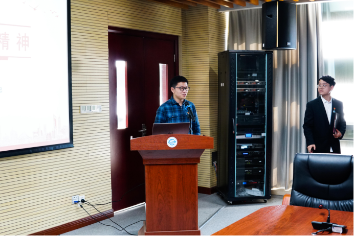 八位入围决赛的员工党支部书记依次进行演讲。2021级硕士联合党支部书记马海川分享的主题是“南泥湾精神”。