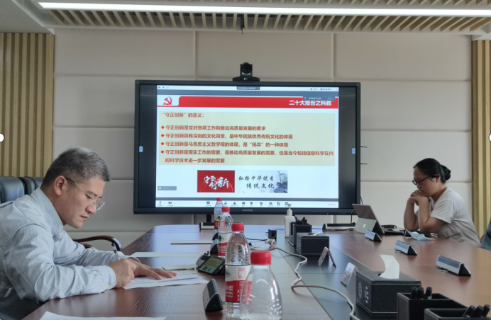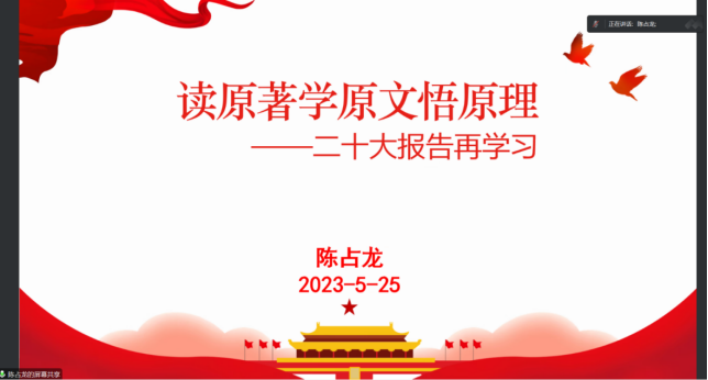 为全面贯彻落实党的二十大精神,更好地认识和肩负起科技工作者的历史责任,2023年5月25日下午,正值答辩季,陈占龙副经理以“读原著学原文悟原理——二十大报告再学习”为题,为计算机应用系全体教师讲授了一堂主题教育专题党课。