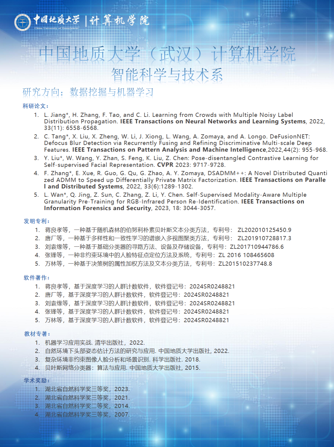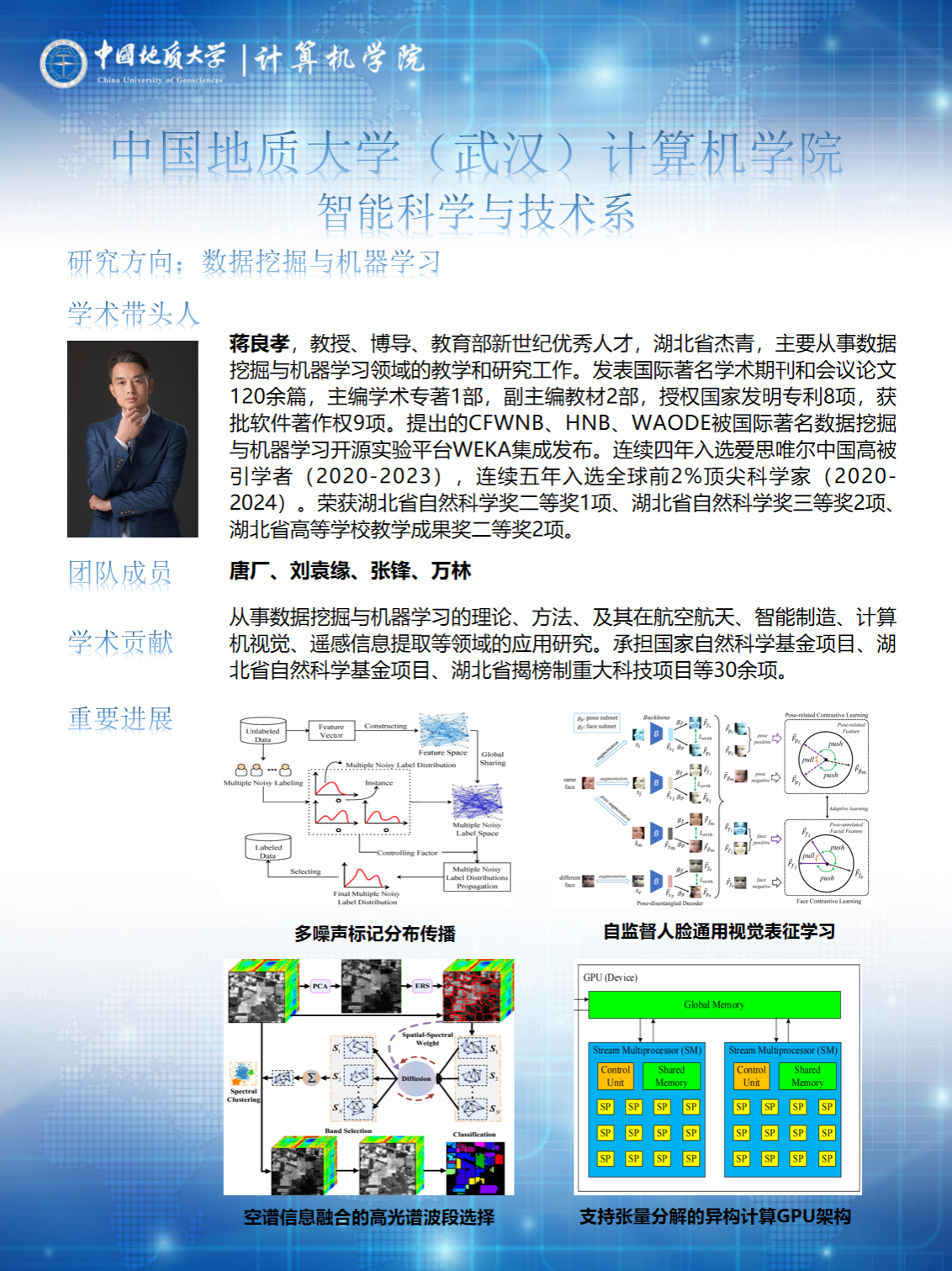 球友会蒋良孝教授领导的团队在数据挖掘与机器学习理论及其应用研究领域连续获得国家自然科学基金项目、湖北省自然科学基金重点项目、湖北省揭榜制重大科技项目等资助,自主研发数据挖掘与机器学习系列理论及其应用创新成果,在著名学术刊物及国际会议上发表论文300余篇,拥有发明专利30余项,软件著作权20余项,出版教材专著4部,荣获湖北省自然科学奖二等奖等7项奖励。