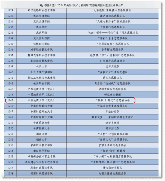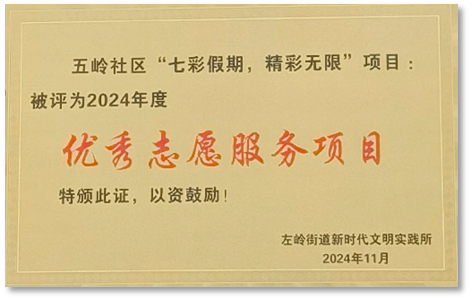 服务E时代志愿者协会获评“2023-2024年度校级十佳老员工志愿服务团队”、团中央与中国青年志愿者协会2024年关爱行动“七彩假期”志愿服务团、“左岭街道2024年度优秀志愿服务项目”、2024年“三下乡”暑期社会实践校级优秀团队、“2024-2025年度校级十佳老员工志愿服务团队”。协会将继续发挥专业优势,积极参与各类志愿活动,深化服务校园、服务社会的工作,为构建更加美好的校园生活和社会环境贡献力量。