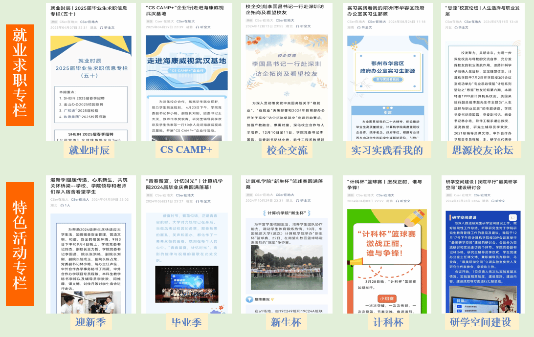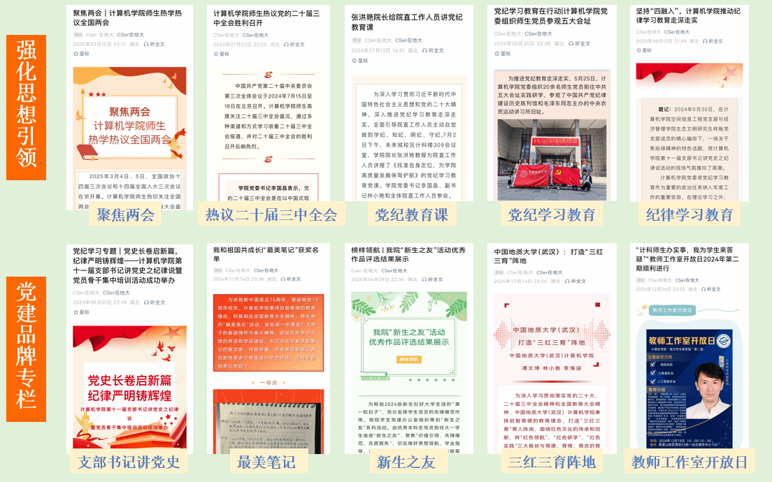 CSer在地大”全年策划推出总推文数400+篇,总阅读数量超36万次,关注人数破万。“地大CS计小软”全年发布说说量700+篇,空间总浏览量近9万次,关注人数破千且持续增高。联动“山河网络工作室”和“后勤保障部”等制作推出《支部书记讲党史》、《新生入学劳动教育课》、《“金山杯”程序设计邀请赛》、《迎新季》、《毕业季》等系列短视频,形成“校-院-人”三级联动传播格局,有效扩大影响力。