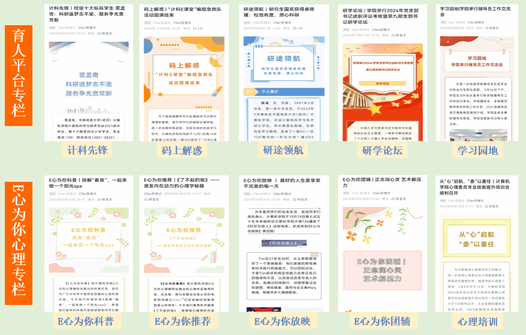 团属新媒体平台强化思想引领,打造“党建品牌专栏”、“育人平台专栏”、“E心为你心理专栏”、“就业求职专栏”、“特色活动专栏”等五项特色品牌专栏,最终实现从内容生产到价值共振的质变。平台获评2024年度校级“十佳团属新媒体平台”、新媒体组组长获评2024年度“十佳团属新媒体达人”、原创视频《南望山下,未来已来》获评2024年度校级“优秀视频”、原创内容《迎新季|24级本科CSer们的数据大揭秘》获评2024年度校级“优秀原创内容”。团属新媒体平台将持续加强对新时代中国青年的价值引领,引导青年争做有理想、敢担当、能吃苦、肯奋斗的新时代好青年,真正成为数字时代青年思想引领的重要平台!