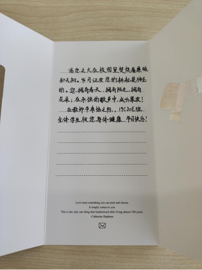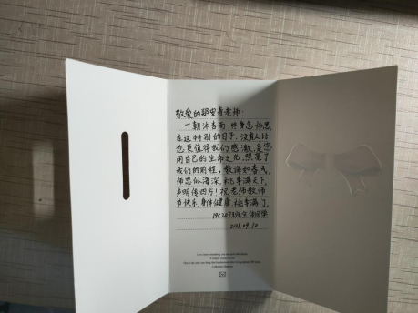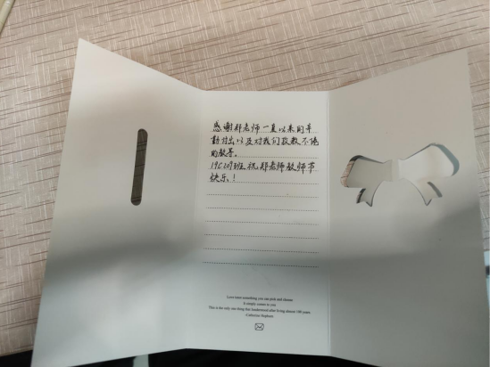 郑安寿老师:虽然只是一份贺卡和几句祝福,但还是真心的觉得高兴和欣慰。这样的活动也增进了师生间的情谊。很感谢同学们送来的祝福和礼物,谢谢大家。希望之后我们共同努力,共同进步。也希望每一个充满着希望和梦想力量的老员工,都能够好好规划自己的人生,青春无悔。胸怀天下,脚踏实地,时间和努力会塑造更好的自己。坚持向前,努力拼搏,为美好的未来而奋斗。