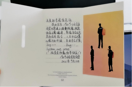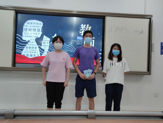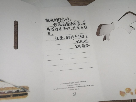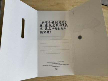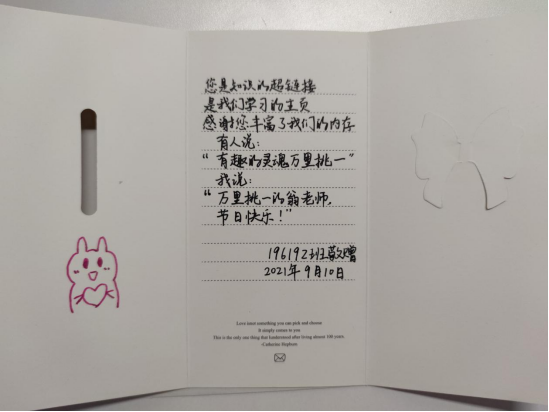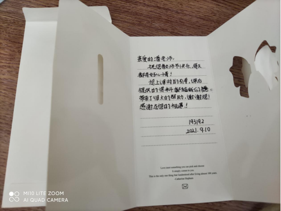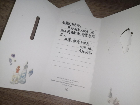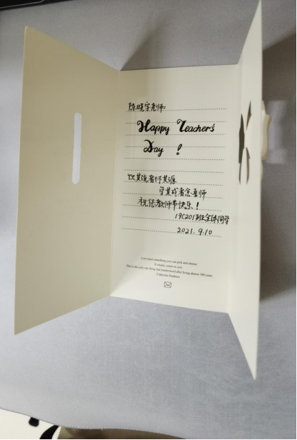 陈云亮老师:首先就是感动,听到同学们对我的祝福,看到同学们给我送的花束与贺卡,身为一名教师,我感到无比的自豪。真的十分感谢同学们对我的祝福,为了不辜负大家期望,我愿用更加饱满的热情上好每一堂课,用更为亲切的关怀对待每一位员工。我也祝各位同学身体健康,学业有成。