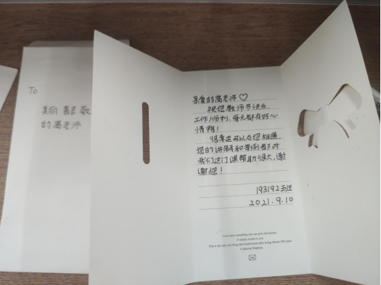 樊媛媛老师:收到同学们的贺卡很开心,也很惊喜。今天教师节,我借此勉励自己。在教师节收到贺卡是对我的工作最大的肯定了。平时管你们很严,也是怕你们走弯路,大家还是一定要好好学习,好好上课。