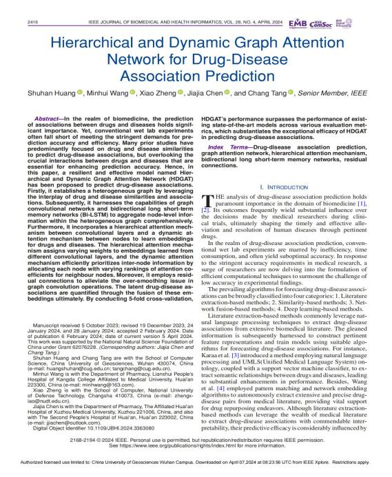 个人简介:黄舒涵,男,共青团员,来自广东深圳,2021级软件工程专业,科研导师为唐厂教授。平均学分绩点为4.18/5.0,位列专业第一(1/99),英语六级成绩为549分。本科期间在唐厂教授的指导下,以独立第一作者身份产出2篇学术论文,其中第一篇已发表在中科院SCI计算机类一区期刊《IEEE Journal of Biomedical and Health Informatics》(IF=7.1,已见刊)上,第二篇投稿至中科院SCI计算机类一区期刊《Information Fusion》(IF=16.1,大修返修中),获得软件著作权1项。此外,在校曾获多项荣誉奖项,如国家奖学金、信息拔尖人才奖学金、第十一届“泰迪杯”数据挖掘挑战赛全国一等奖等。目前已成功保研至清华大学深圳国际研究生院数据科学和信息技术专业,并在百度进行算法实习。