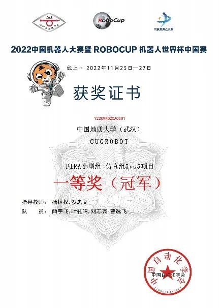 在杨林权老师和罗忠文老师的悉心指导下,CUG机器人团队勤奋备战、刻苦努力,在FIRA小型组-仿真组的5vs5和11vs11两项比赛中斩获冠军和亚军,2项一等奖。中国机器人大赛暨ROBOCUP机器人世界杯中国赛是国内规模最大、影响力最强、学术水平最高的机器人技术盛会之一。该赛事已于2020年成功入选中国高等教育学会《2015-2019年全国普通高校学科竞赛排行榜》,同时也在中国高等教育学会发布的《2021年全国普通高校老员工竞赛榜单》中。