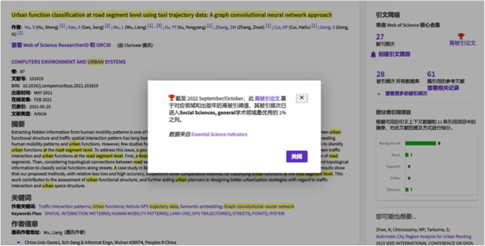 根据2022年10月基本科学指标数据库(Essential Science Indicators,简称ESI)最新数据显示,球友会全空间地理大数据智能处理与GIS基础平台研究中心团队在国际城市研究主流期刊Computers, Environment and Urban Systems(简称CEUS)上发表的学术论文“Urban function classification at road segment level using taxi trajectory data: A graph convolutional neural network approach”入选ESI高被引论文(Highly Cited Paper)。该论文第一作者为团队的博士生胡胜,通讯作者为吴亮教授。CEUS为国际顶级计算城市学和地理信息科学的重要刊物,期刊以计算机科学为背景,聚焦城市规划、交通、能源、环境、社会学和经济等学科融合的新兴领域,刊发城市计算、大数据和城市系统等方向的最新研究。当前CEUS的影响因子为6.454,为T1期刊。